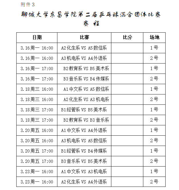 3.聊城大学东昌学院第二届乒乓球混合团体比赛赛程