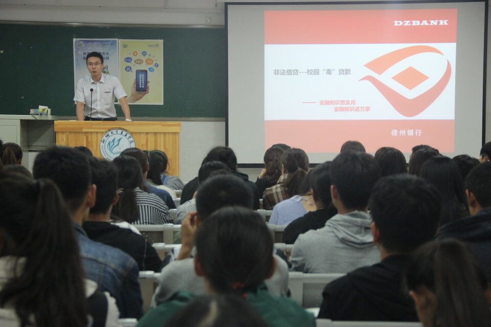 活动开始,德州银行工作人员为学生分发了校园“毒”贷款宣传页,让同学们对校园贷的危害进行简单了解。接着,王经理结合真实案例和自身经历分别从校园贷的特征、贷款认知误区及辨别非法金融机构方法等方面为同学们普及了相关金融知识。随后,为让同学们了解更多支付结算基础知识,王经理从个人银行账户分类、开立账户要知和维护账户安全的角度为同学们做了悉心讲解,提醒学生们拒绝“校园贷”、“现金贷”。活动最后,王经理采用提问的方式围绕金融安全知识与同学们进行互动,充分调动了现场气氛,同学们积极回答问题,使本次宣讲内容得到进一步拓展和巩固。至此,本次活动圆满结束。