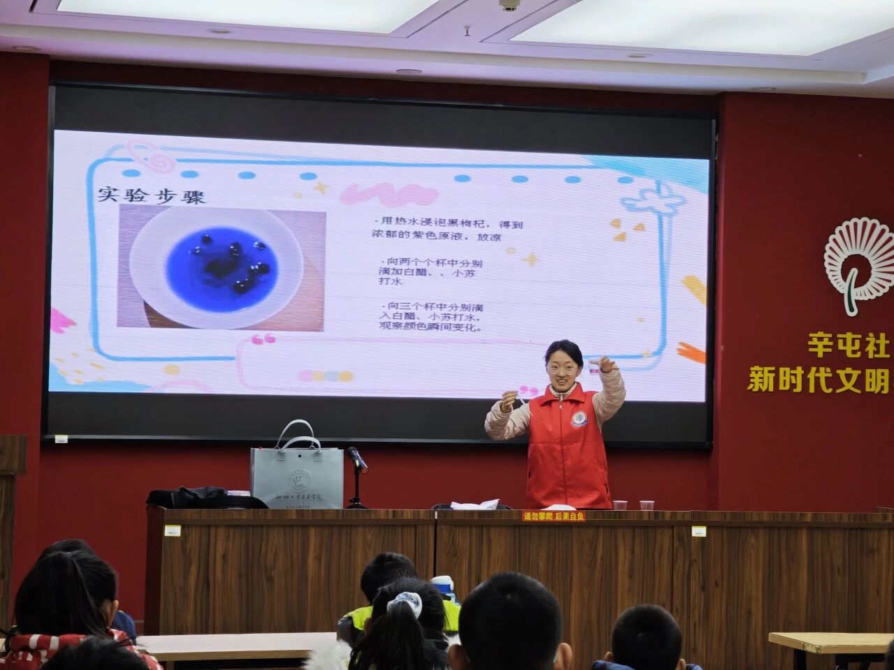 活动开始,志愿者们以“酸碱魔法秀”为切入点,用奇幻的语言抓住小朋友的好奇心,向小朋友们介绍实验内容。志愿者们耐心讲解:“黑枸杞里含有天然花青素,这种物质遇到酸性或碱性物质会发生颜色变化,就像我们身边的‘天然指示剂’”,同时通过简单类比,让小朋友们理解酸、碱的基本特性,以及小苏打(碱性)、醋酸(酸性)与黑枸杞水反应的科学原理,为后续动手实验筑牢知识基础。