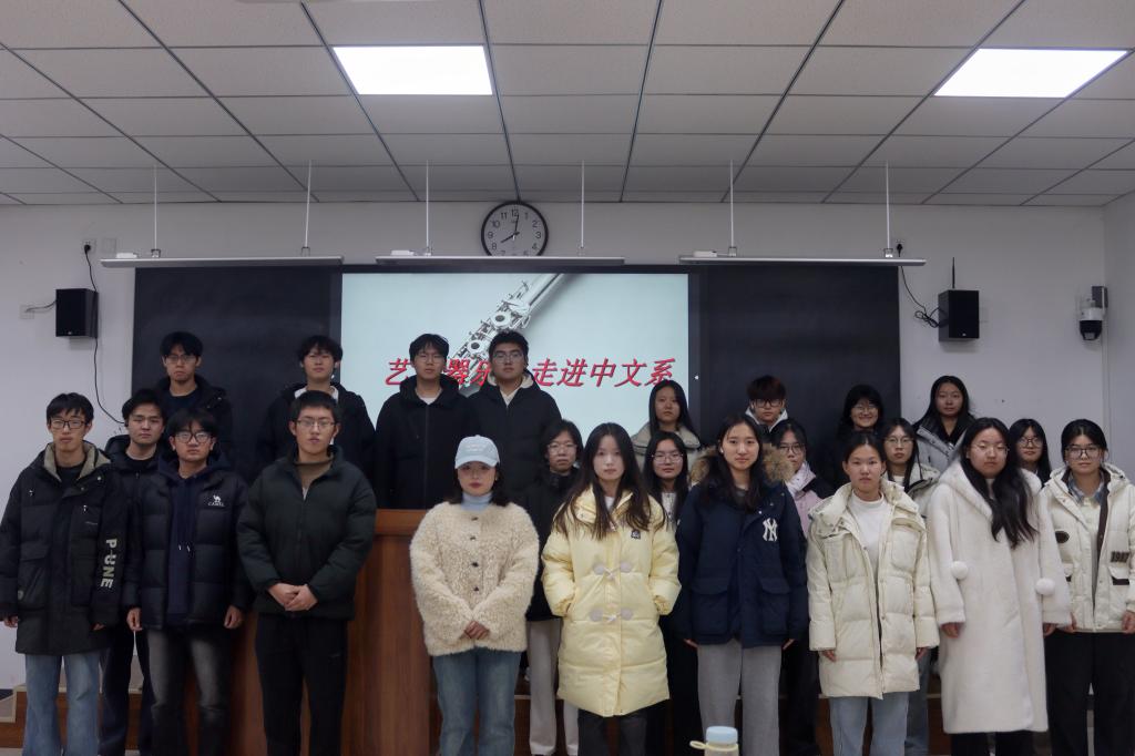 活动伊始,社员们通过图文结合的形式,从长笛的起源与发展、形制分类、演奏姿势与气息控制等基础知识展开讲解,同时,穿插了不同流派的演奏视频、经典曲谱片段赏析,将专业的民乐知识转化为通俗易懂的内容,帮助同学们快速建立对长笛的认知。随后,社员们带来了精彩的现场演奏,通过演绎多首经典曲目展现了器乐的独特表现力,与中文系学子共同探讨音乐背后的文学意象、情感表达与文字的节奏,这场跨界对话让大家领略到艺术形式的相通相融。